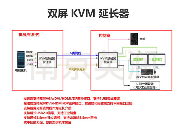 延长器由发送端和接收端组成,发送端和电脑主机一般放置于机房的机柜内,接收端和显示器、键鼠等一般放置于控制室的控制台上,发送端和接收端之间一般使用网线或者光纤连接。